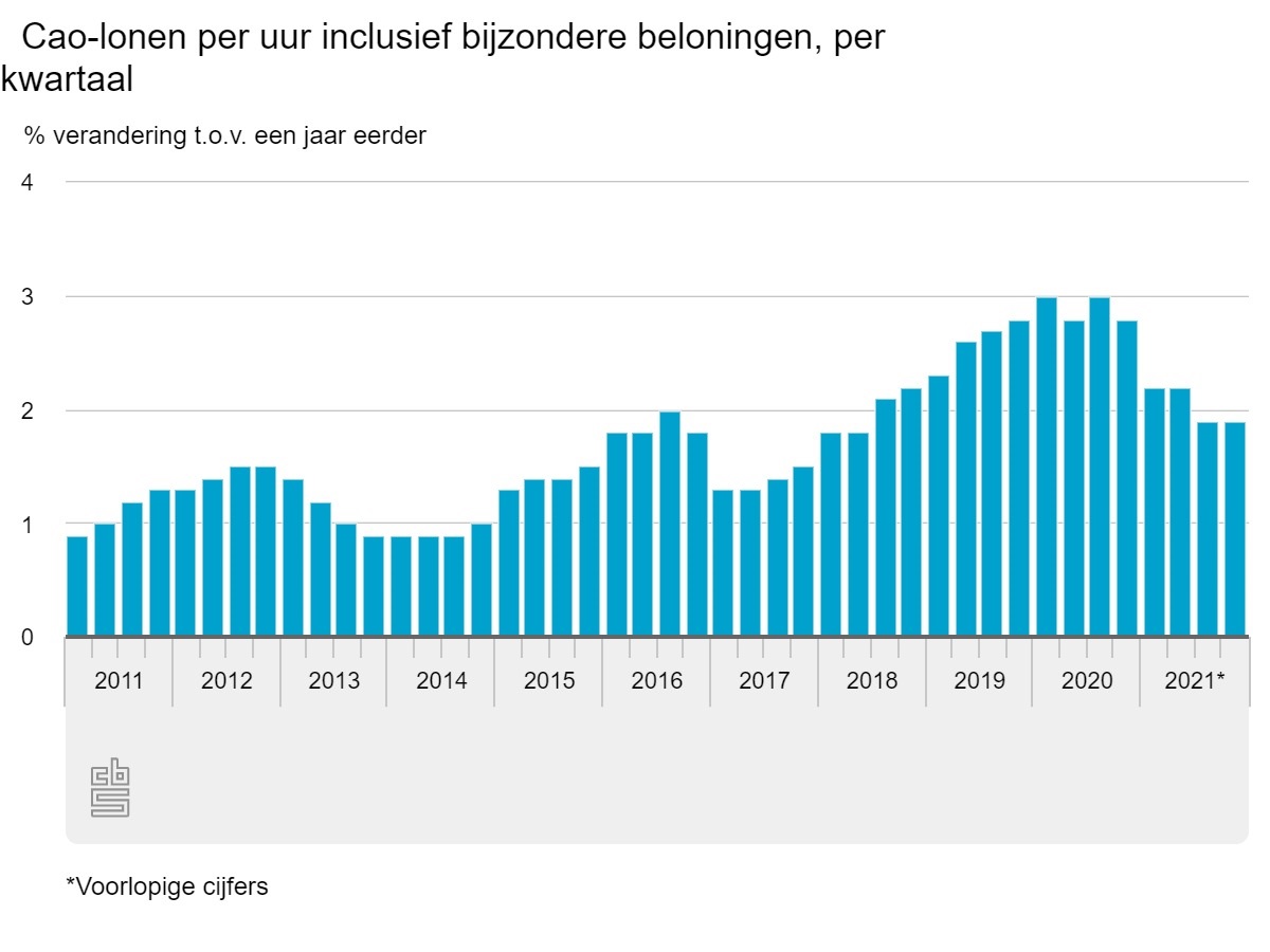In de eerste helft van 2021 lag de cao-loonstijging met 2,2 procent lager dan in het jaar ervoor; in de tweede helft werd dat nog lager, namelijk 1,9 procent.